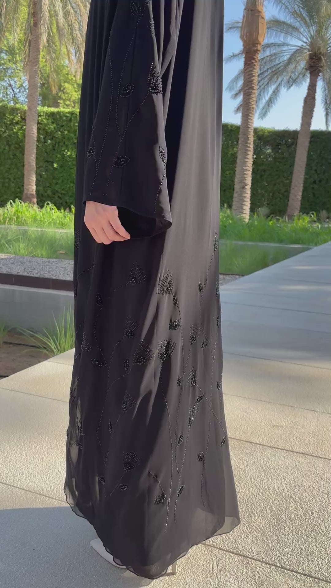 Die Abaya ist mit feinen Stickereien verziert, die kunstvoll in geschwungenen, floralen Mustern verlaufen und harmonisch mit den eingearbeiteten Perlen kombiniert sind, wodurch ein edler und raffinierter Look entsteht. Hol dir den einzigartigen Stil der Emirate mit unserer eleganten Chiffon Abaya. Hergestellt in den Vereinigten Arabischen Emiraten, vereint diese Abaya die zeitlose Eleganz und die moderne Raffinesse, die die Mode der Region auszeichnen. Der leichte, fließende Chiffon-Stoff sorgt für einen luxuriösen Look, der sowohl tagsüber als auch zu besonderen Anlässen perfekt ist.